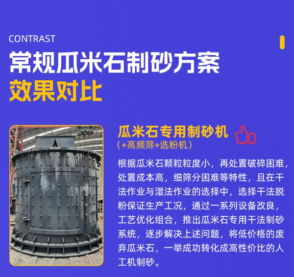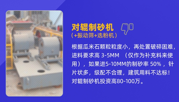 根據(jù)瓜米石顆粒粒度小,再處置破碎困難,進料要求高3-5MM(僅作為補充料來使用),如果進5-10MM的制砂率50%,針片狀多,級配不合理,建筑用料不達標(biāo),對輥制砂機投資高80-100萬。