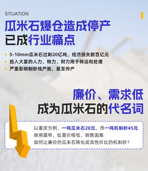 瓜米石又稱石沫、石粉、豆石,因品相與瓜子片相像,顆粒小而又常見于針片狀、扁平狀存在,粒型特別差,所以限制了其的使用領(lǐng)域,給骨料銷售帶來困難,時常于低價格或者廢棄料處置。