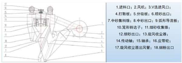 第三步:采用人工砂石風(fēng)選復(fù)合式脫粉機(jī),集篩分風(fēng)選于一體,將物料分為粗細(xì)不同的砂和粉,工藝簡(jiǎn)約,節(jié)能環(huán)保。