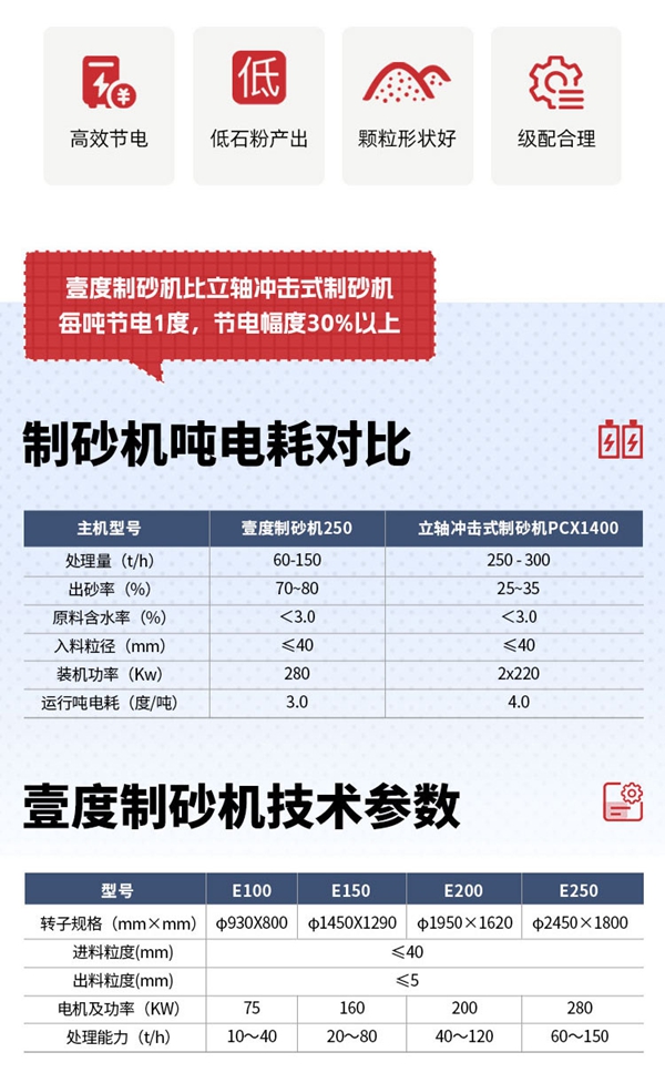 壹度制砂機(jī)與“石打石”沖擊式制砂機(jī)相比,節(jié)電可達(dá)30%,且出砂成品質(zhì)量?jī)?yōu)良,符合國(guó)標(biāo)二區(qū)標(biāo)準(zhǔn)。