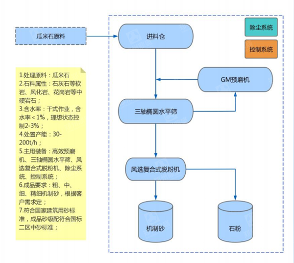 瓜米石俗稱為石沫,顆粒大小與綠豆相似,是一種碎石料,又稱為石粉、豆石,因品相與瓜子片相像,顆粒小而又常見于針片狀存在,所以限制了其的使用領(lǐng)域,給骨料銷售帶來困難,時常于低價格或者廢棄料處置。為幫助客戶解決瓜米石使用面窄,處置價格低,銷售困難的問題,鼎盛公司抓住客戶困境重視客戶體驗,并根據(jù)瓜米石顆粒粒度小,再處置破碎困難,處置成本高,細篩分困難等的特性,且在干法作業(yè)與濕法作業(yè)的選擇中,選擇干法脫粉保證生產(chǎn)工況,通過一系列設(shè)備改良,工藝優(yōu)化組合,推出瓜米石專用干法制砂系統(tǒng),逐步解決上述問題,將低價格的廢棄瓜米石,一舉成功轉(zhuǎn)化成高性價比的人工機制砂。