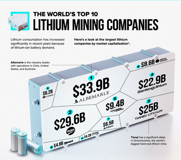 按市值劃分,世界上較大的鋰生產(chǎn)商是美國(guó)Albemarle(雅寶),市值達(dá)339億美元。Albemarle Corporation與智利第二大生產(chǎn)商Sociedad Químicay Minera de Chile (SQM)合作,在智利的Salar de Atacama開(kāi)展鋰礦開(kāi)采業(yè)務(wù)。Salar de Atacama自1980年代以來(lái)便一直從事鋰礦的開(kāi)采生產(chǎn),目前占據(jù)了全球近四分之一的鋰礦產(chǎn)量。