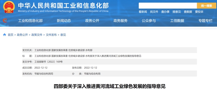 12月12日,工業(yè)和信息化部、國家發(fā)展改革委、住房城鄉(xiāng)建設(shè)部、水利部四部門聯(lián)合發(fā)布《關(guān)于深入推進黃河流域工業(yè)綠色發(fā)展的指導(dǎo)意見》,以下簡稱《意見》。