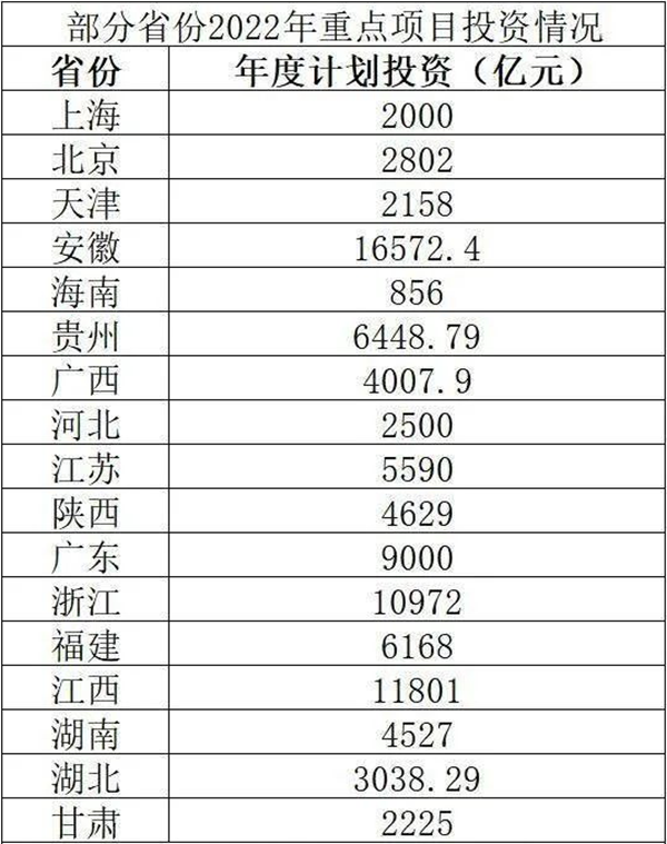 截至目前,全國已有19個(gè)省市區(qū)公布了2022年重點(diǎn)項(xiàng)目投資計(jì)劃清單,包括北京、上海、天津、廣東、江蘇、浙江、四川、貴州、河北、安徽等。其中,安徽、江西、浙江三省年度計(jì)劃投資均超萬億元。