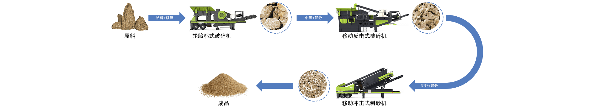 設備配置:WJC輪胎鄂破 WAF反擊破 WRV制砂機